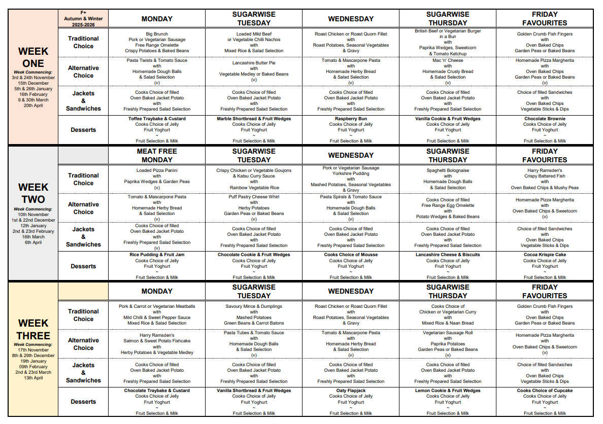 Children who receive either a Free School Meal or a Paid School Meal will choose items from the following Menu provided by Lancashire County Council: