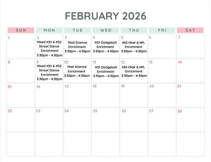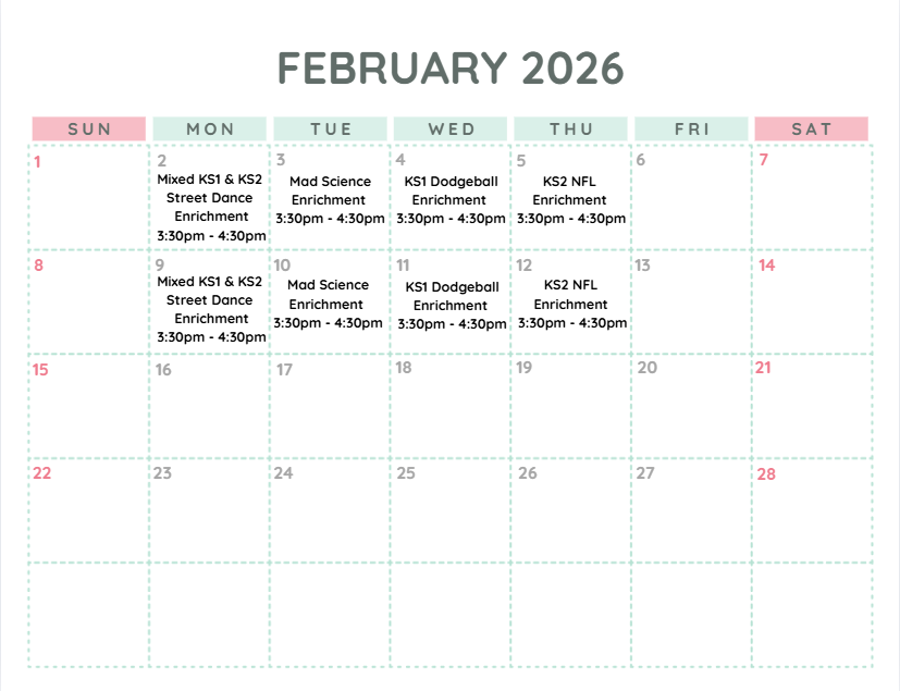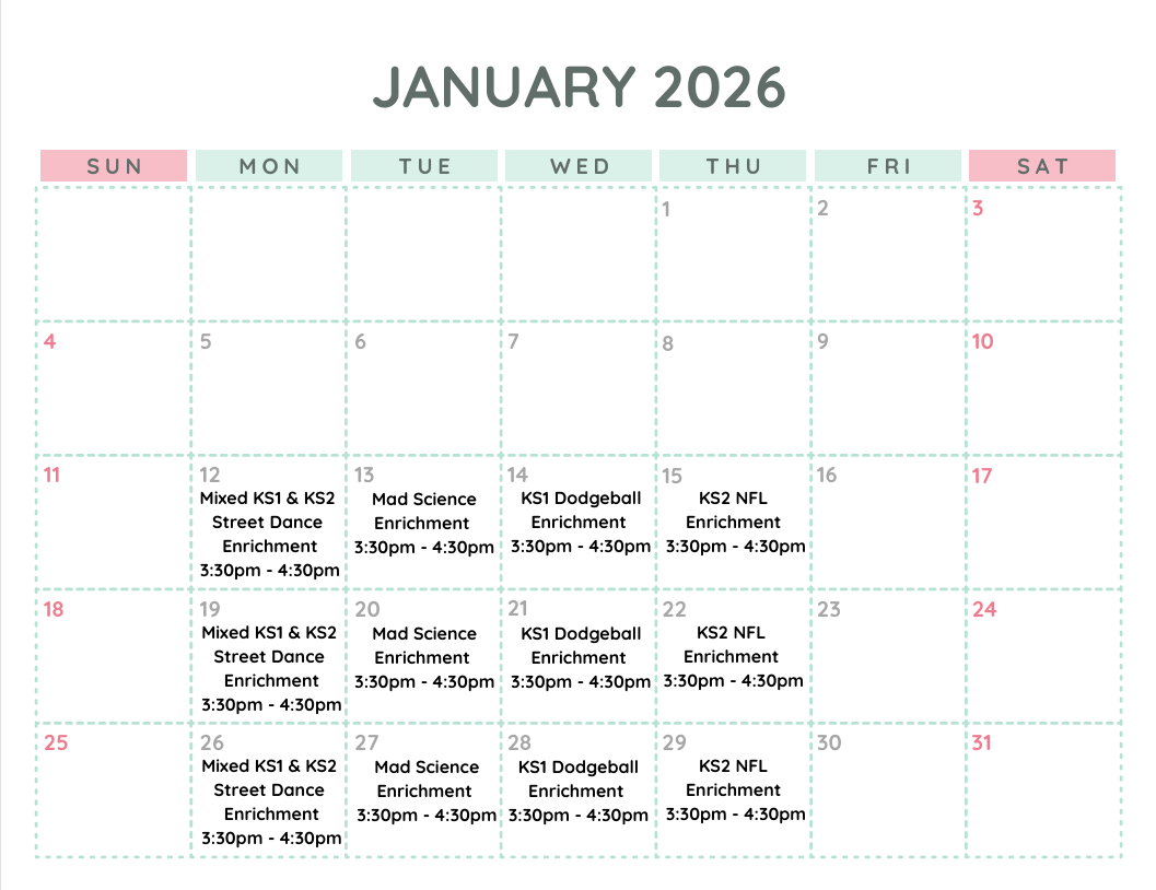 Please see below timetable of Enrichment Clubs that will be running in Spring Term 1 2026: